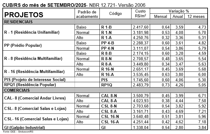 O Sinduscon-RS divulgou hoje (1º.10.2025) o CUB/m² – Custo Unitário Básico por metro quadrado de construção de setembro de 2025, com base na NBR 12.721/2006.